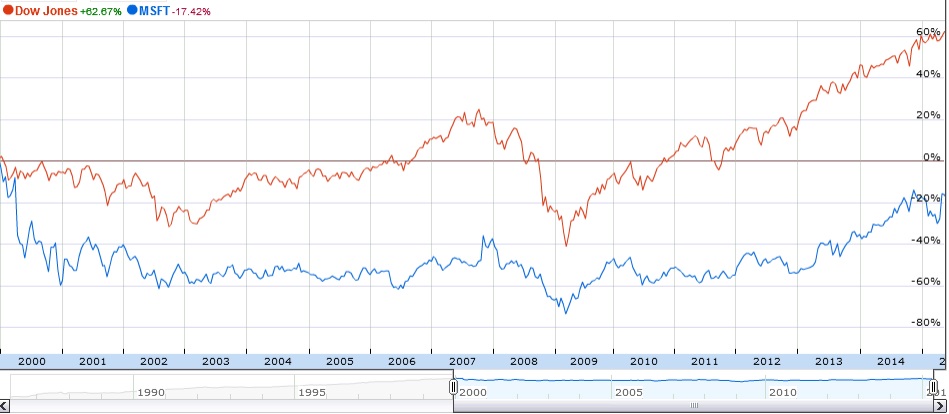 MSFT revenue went up from $23B to $95B and net profits went up from $9B to almost $22B. The stocks is down -17% over the same time while the Dow Jones in comparison went up 60%. While the performance of the company was great, to justify the valuations the company had to grow 5-6X on net profit line instead of the 1.5X that they did during the same time frame.